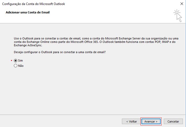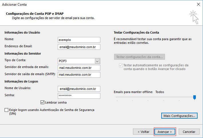 4 - Escolha POP ou IMAP e pressione Avançar > .